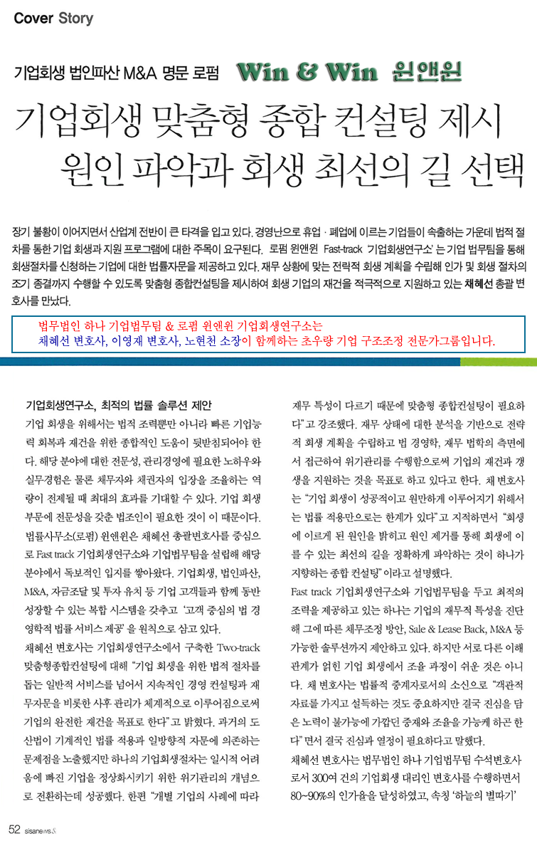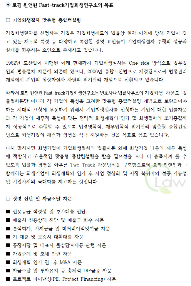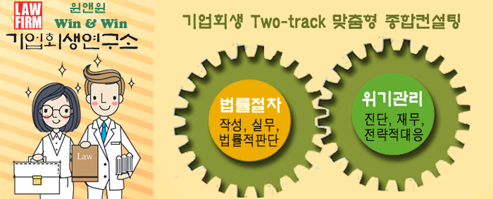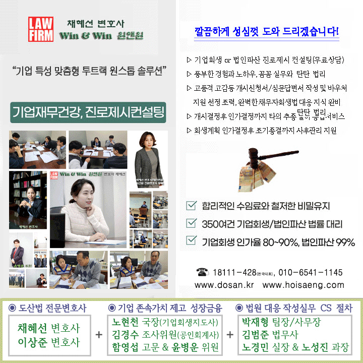 로펌 윈앤윈 | 대표자: 채혜선 | (06634) 서울특별시 서초구 서초중앙로22길 17(서초동), 메가스터디빌딩 2층TEL : 18111-428(전국대표), (02)588-8114, 010-6541-1145(긴급) | FAX : (02)6008-7116 | E-mail : hoisaeng@naver.com 광고책임 : 변호사 채혜선 | Copyright (c) 2023 로펌 윈앤윈 Fast-track기업회생연구소 All Rights Reserved.